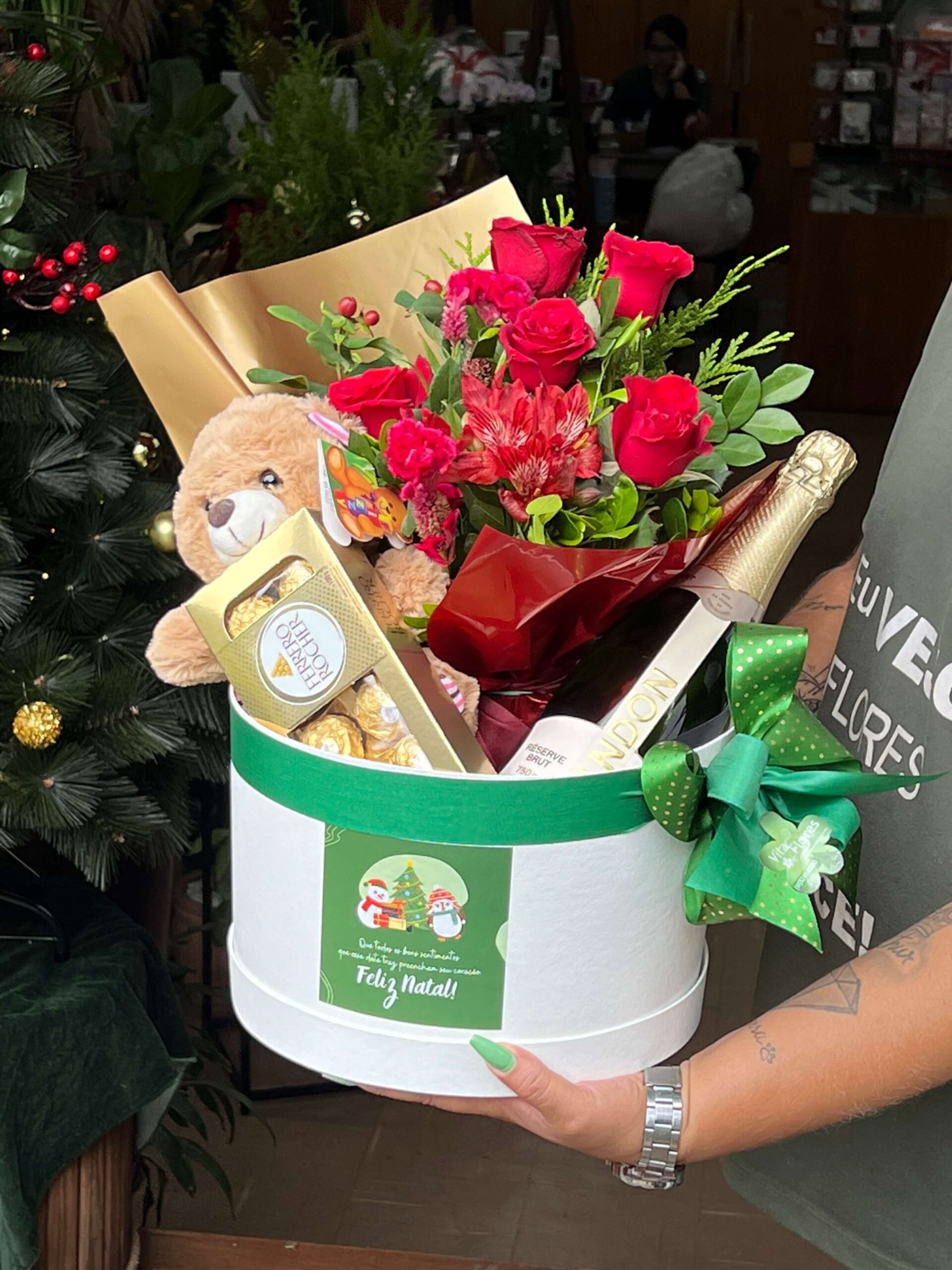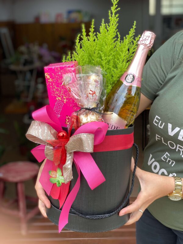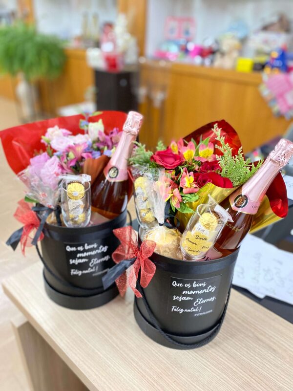BOX COM MINI PANETONE, TAÇA ESCRITO FELICIDADES, SAÚDE, PAZ, BOMBOM FERREIRO E VINHO PORTUGUÊS OU ARGENTINO OU CONDE ROSÉ